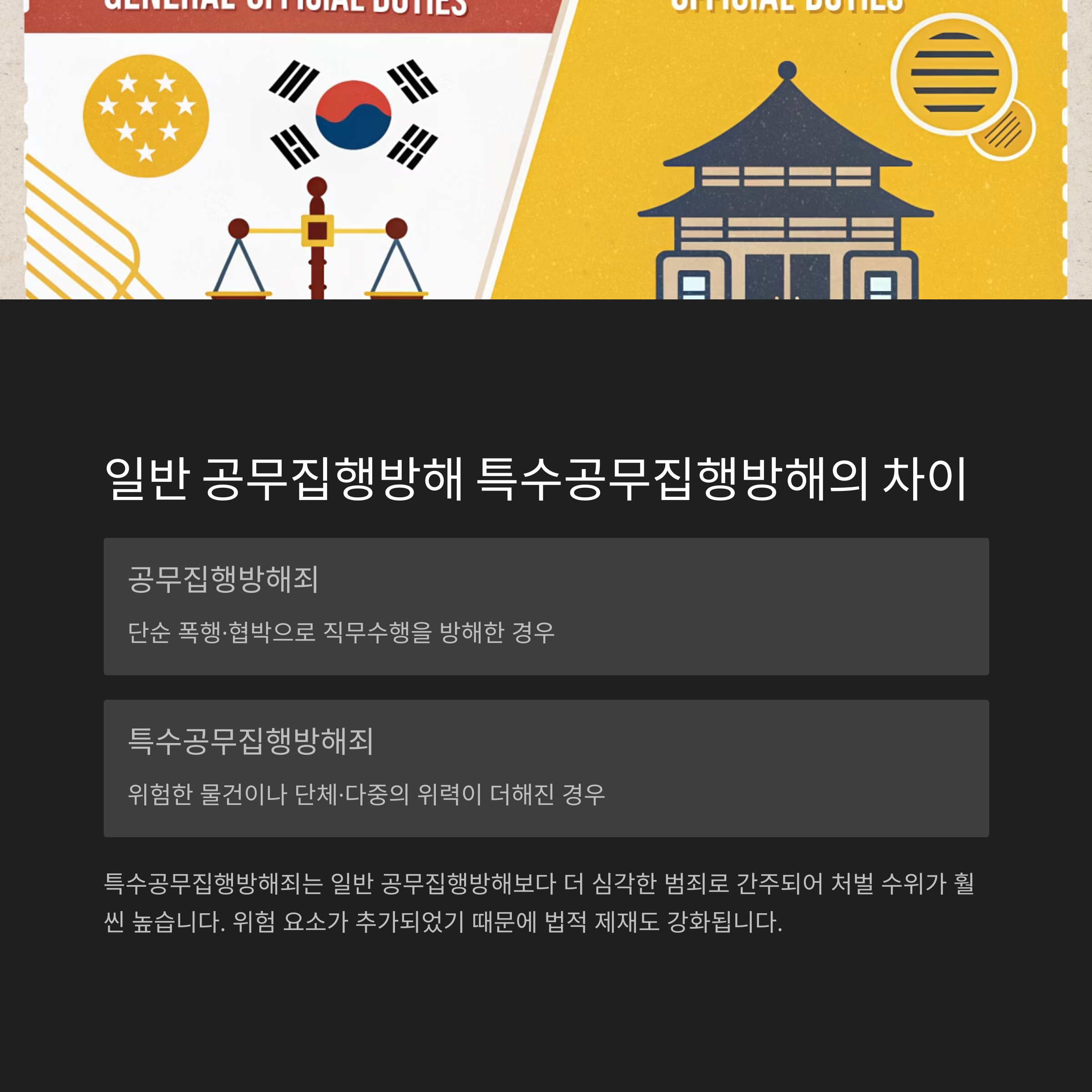 특수공무집행방해죄는 여기에 위험한 물건이나 단체·다중의 위력이 더해졌을 때 적용됩니다.