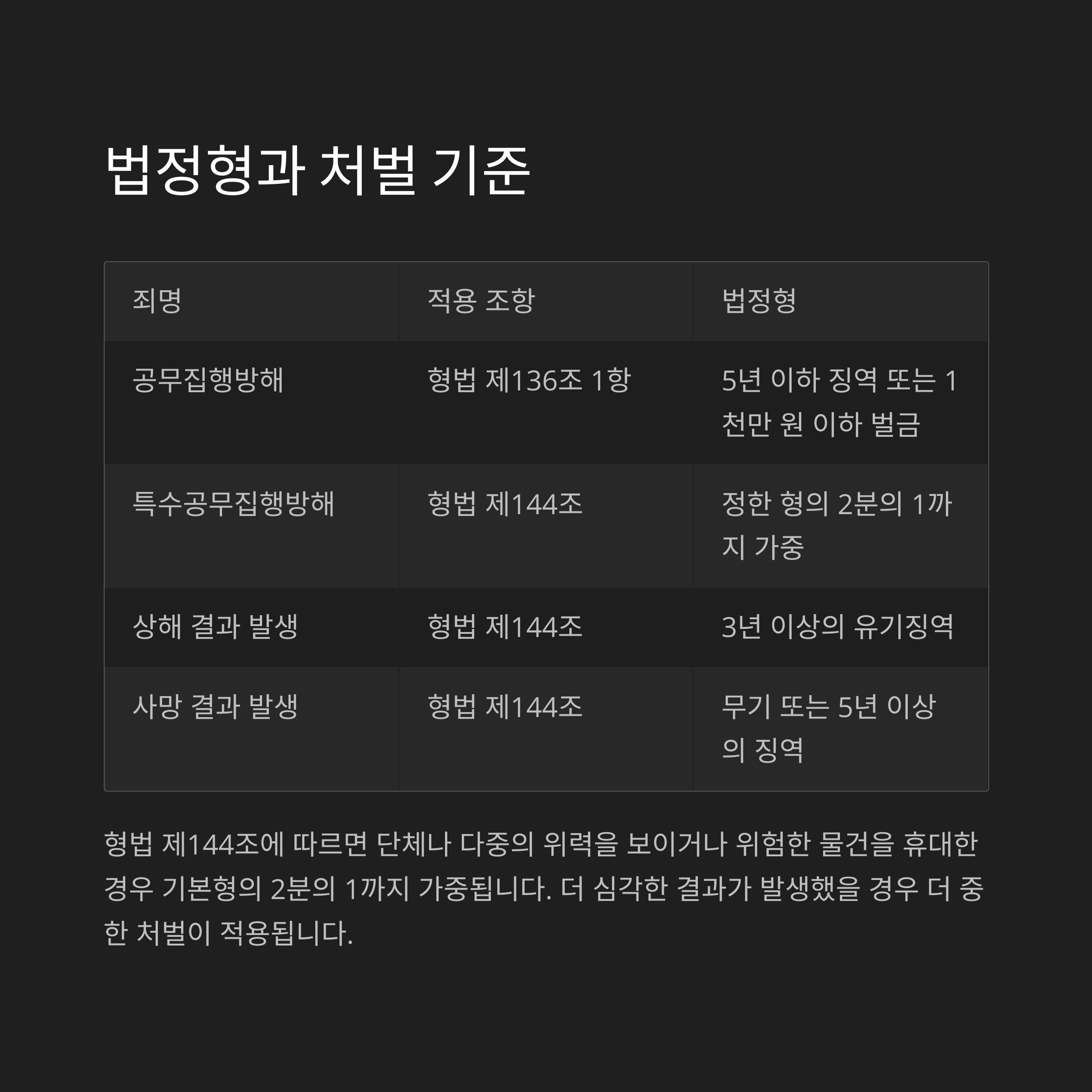 | 공무집행방해 | 형법 제136조 1항 | 5년 이하 징역 또는 1천만 원 이하 벌금 |