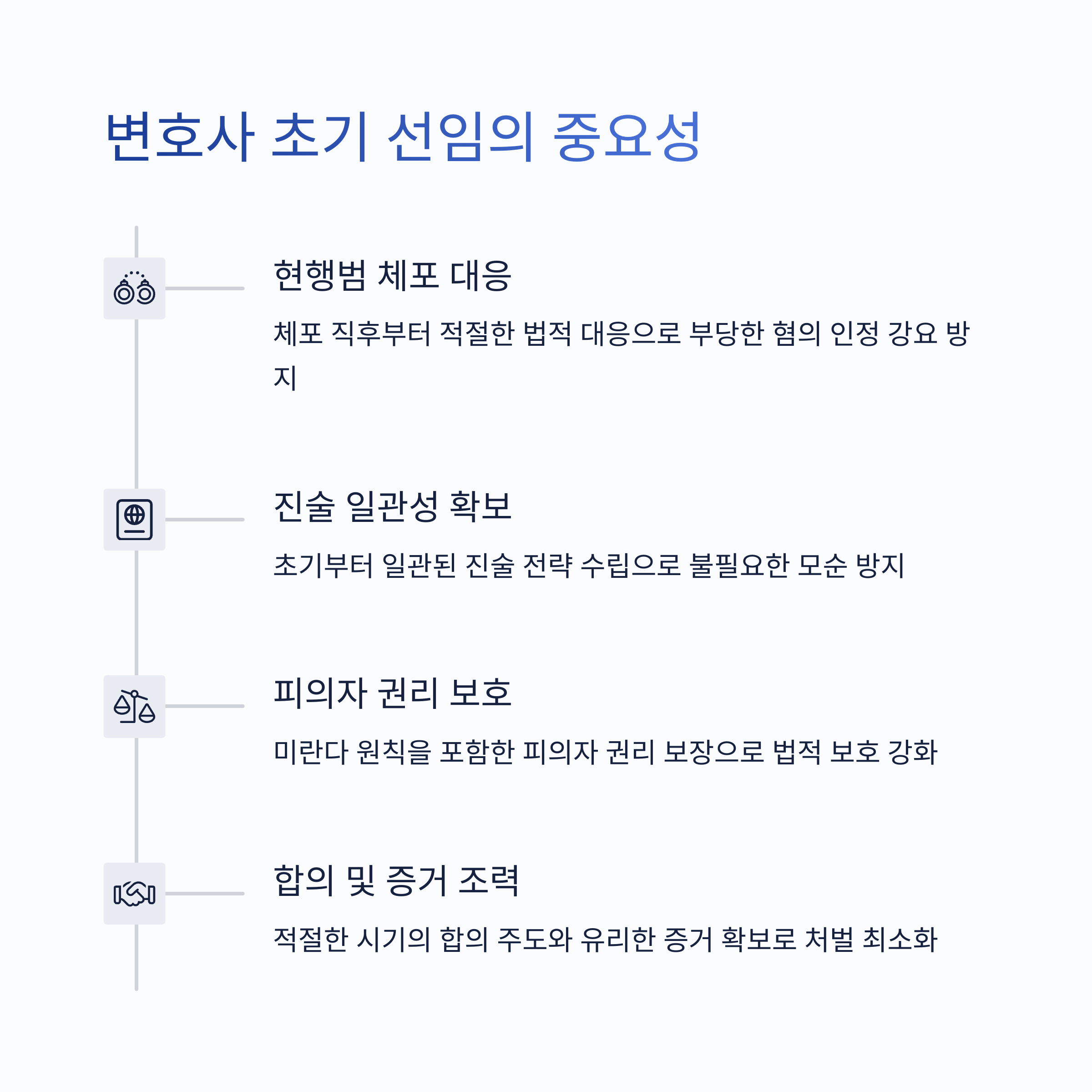 - 피의자 인권 보호와 사건 방향 설정을 위해 필수입니다.