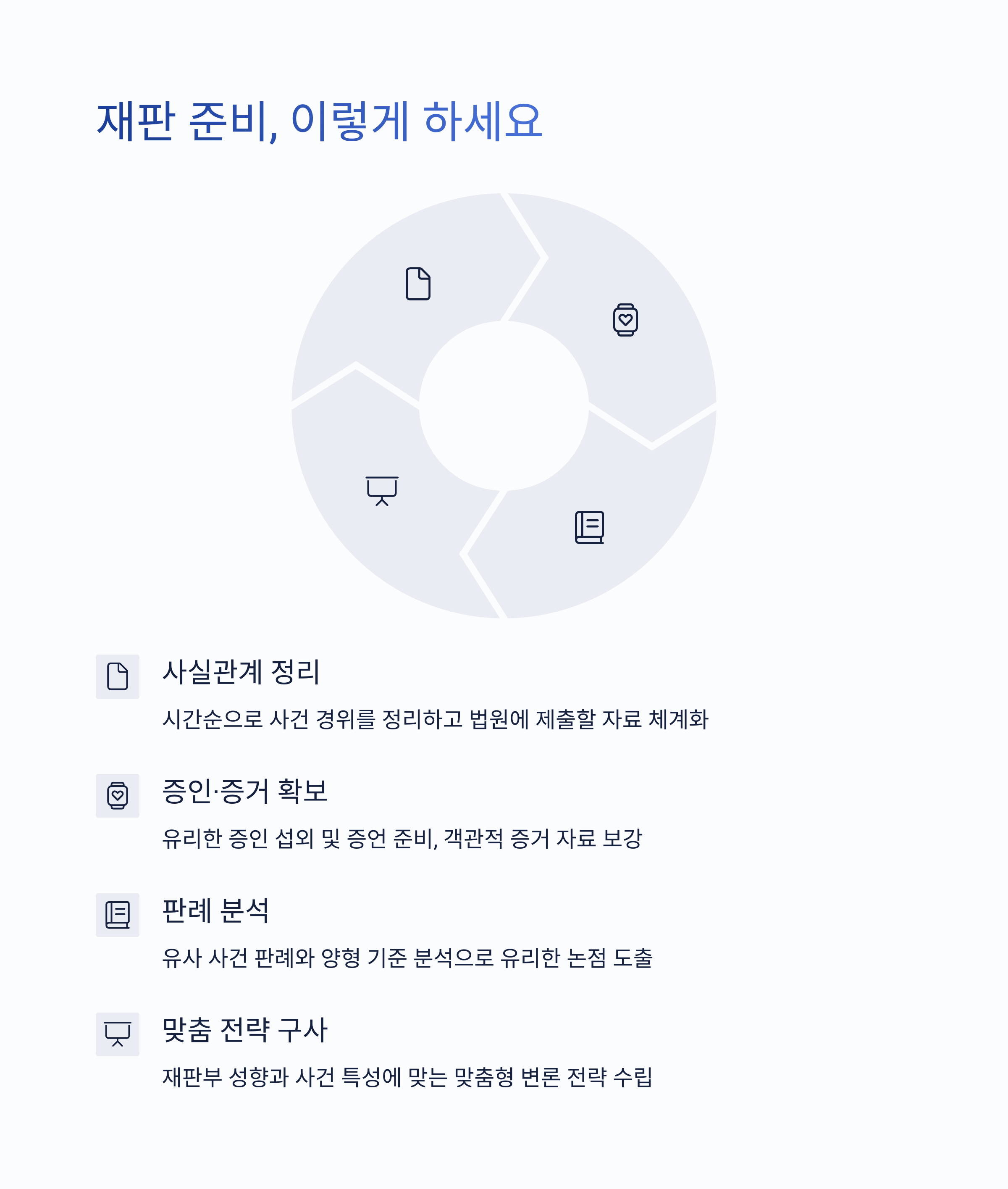 - 사건 초기에 전략을 세워야 향후 재판까지 유리하게 이끌 수 있습니다.